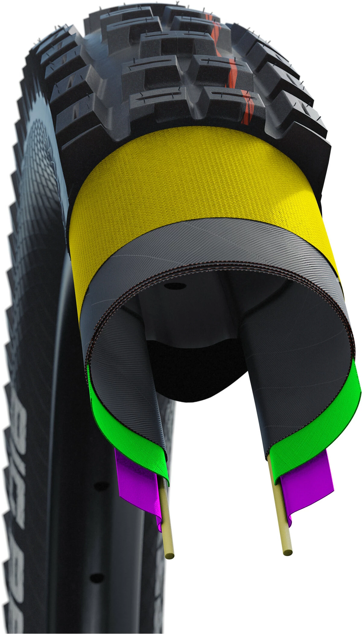 Super Gravity ist im Kern eine neue Karkassenkonstruktion. Das Prinzip kennt man vom Motorradreifen. Schwalbe hat das Beste davon fürs MTB weiterentwickelt. Bei Super Gravity bestehen die Seitenwände aus vierfachem Karkassenmaterial, aber unter der Lauffläche liegt es nur zweifach (Bei der klassischen Downhillreifen-Konstruktion liegt es unter der Lauffläche sechsfach. Das bringt unnötig viel Gewicht und macht die Lauffläche leider steif und hart.).